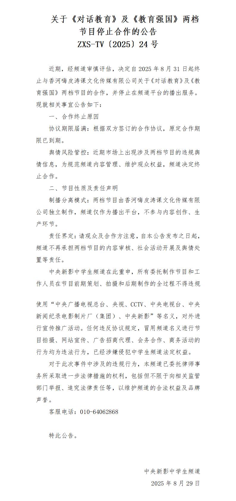 关于《对话教育》及《教育强国》两档节目停止合作的公告