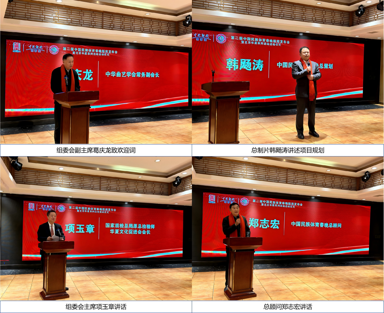 第二届中国民族体育春晚有中华曲艺学会、玖合云启(北京)国际传媒有限公司联合主办,主持人闫嘉欣逐一介绍了到场的各位领导嘉宾:国家质检总局原总检验师、华夏文化促进会会长项玉章;中国广电联合会全民国防宣传教育委员会会长郑志宏;中华曲艺学会常务副会长葛庆龙;中央保健局专家组原组长朱兴;中央民族大学原校长郭广生;中国武术九段、公安大学教授韩建中;国家级非遗心意六合拳传承人李洳波;国家广电总局管理局原局长郭锋;中央广播电视总台“云听”首席战略官李正国;人民日报《中国城市报》社中国城市网主任李自超;环球网副总经理李留申;中国农村信用合作报副社长党云帆等参加了本次发布会。