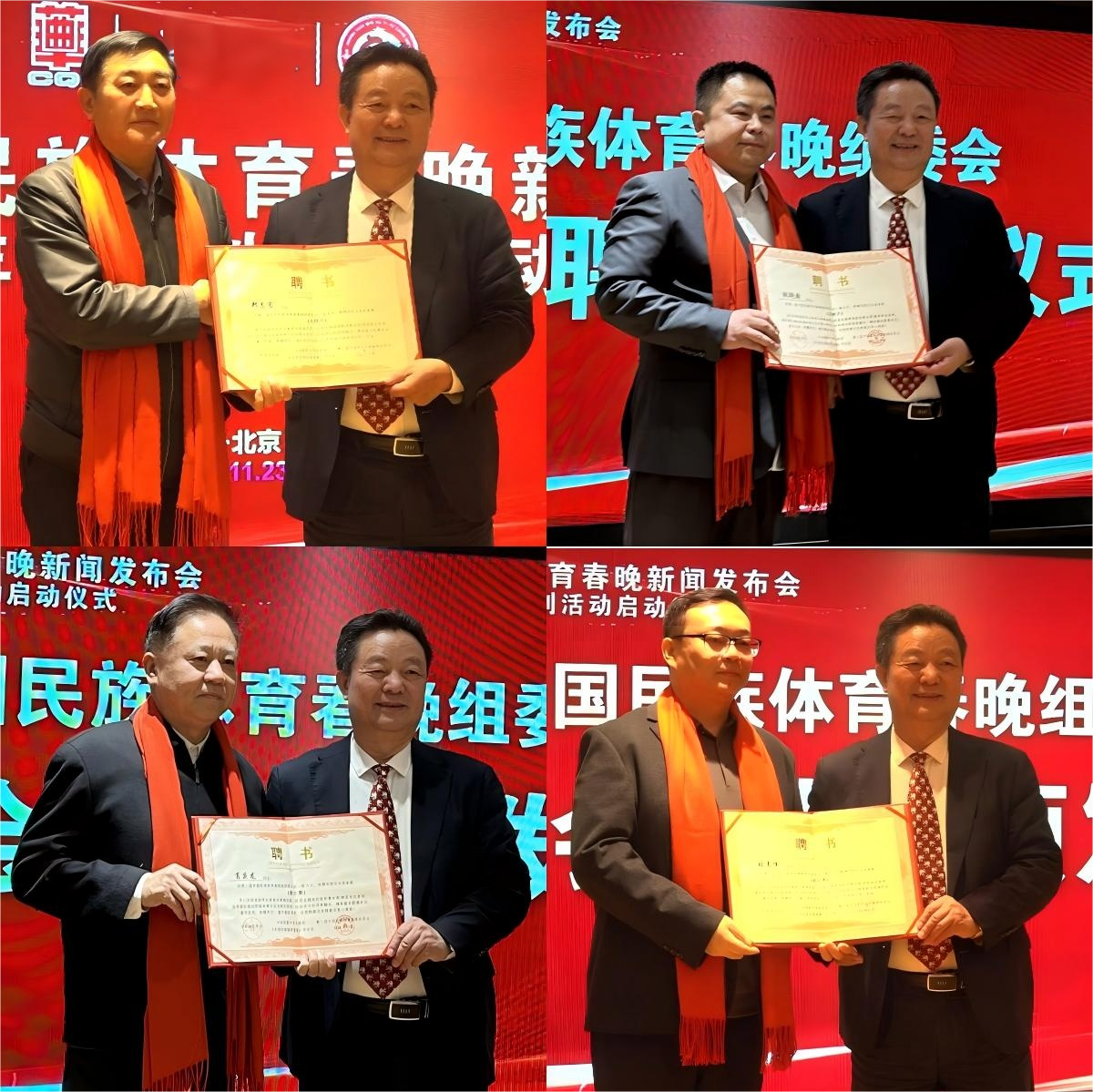 中国民族体育春晚总策划、总制片人韩飏涛进行项目阐述:他描绘了一幅极具吸引力的愿景:“我们将打破你演我看的传统模式,运用容积视觉等尖端科技,让观众‘走进’草原那达慕的摔跤现场,‘触摸’到苗族芦笙舞的韵律。这是一次让民族体育‘活起来、动起来、燃起来’的大胆尝试。”随后,在组委会主席项玉章的主持下,晚会核心架构正式揭晓,一个汇聚了业界权威与顶尖艺术家的“全明星”团队集体亮相,郑志宏受聘为总顾问,葛庆龙受聘为副主席,武术名家李洳波出任武术总顾问,韩飏涛受聘为总制片。韩建中、马文广、朱兴、郭峰、郭广生、石恒臣等体坛与学界泰斗获颁名誉主席聘书为晚会品质护航。全国联动:秘书处及全国各区域执行团队接受聘书与授旗,标志着晚会从“北京主场”迈向“全国舞台”。