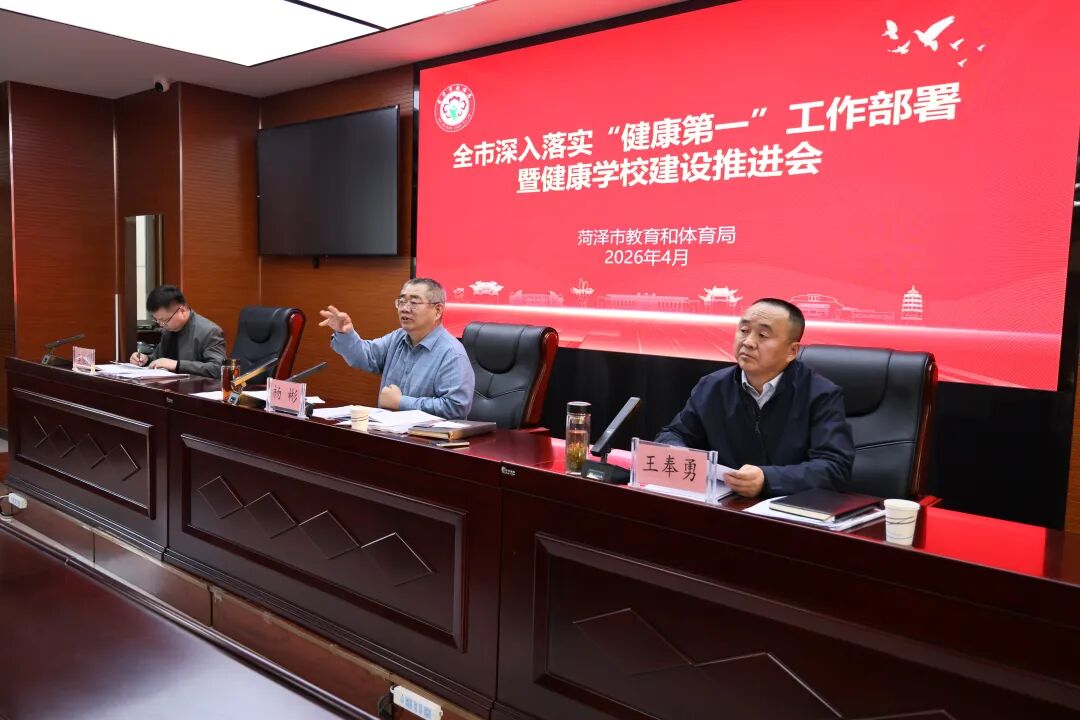 为全面贯彻全省深入落实“健康第一”工作部署暨健康学校建设推进会精神,总结全市健康学校建设成效、分析当前形势、部署2026年重点任务,4月1日,菏泽市教育和体育局召开全市深入落实“健康第一”工作部署暨健康学校建设推进会。市教体局党组书记、局长杨彬出席会议并讲话,市教体局党组成员、副局长王奉勇总结2025年工作,市教体局体卫艺科副科长吴胜利主持会议。